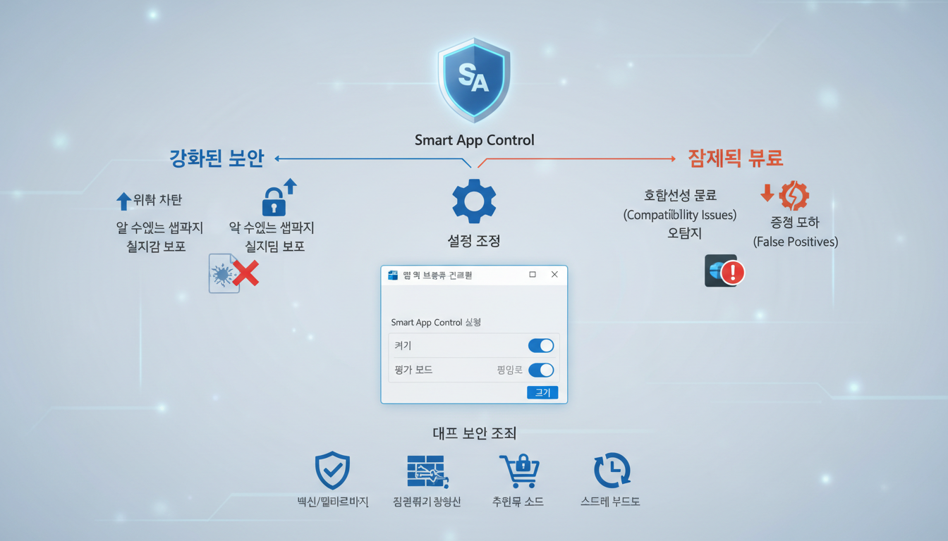 또한, 스마트 앱 컨트롤은 악성 소프트웨어로부터 시스템을 보호하는 데 효과적인 장점이 있지만, 때로는 정상적인 앱이나 개발 도구처럼 서명되지 않은 파일을 실행할 때 이를 차단하는 단점도 가지고 있습니다. 만약 특정 앱이 반복적으로 차단되거나, 개발 과정에서 자주 사용하는 서명되지 않은 파일들을 실행해야 하는 상황이라면 스마트 앱 컨트롤을 끄는 것을 고려해 볼 수 있습니다.